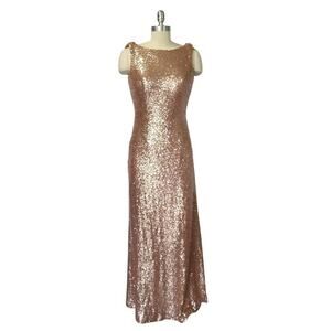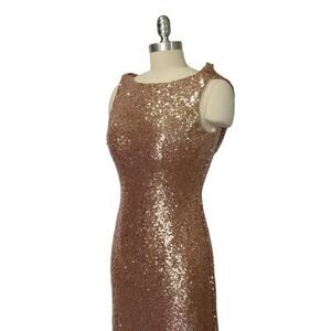 Vintage Y2K fully sequined rose gold prom dress maxi gown from Cristina Wu, size 4. Draped cowl cape back, hidden back zip. Padded bra cups and boned bodice. Fully lined. In gently preowned condition, no flaws noted. Light dust marks on inner lining hem. Measurements are approximate, lying flat.