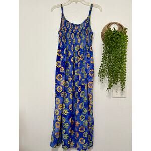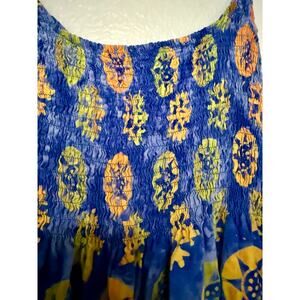 Blue tie dye maxi dress with yellow and green suns and snowflakes, representing both of those seasons. Spaghetti strap style straps, these are NOT adjustable. Ruched chest area with extra stretch. Made in Indonesia. 100% Rayon