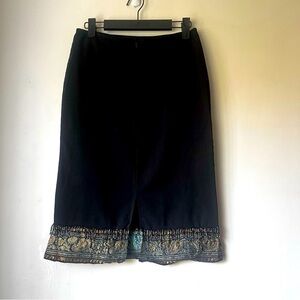 Vintage 90s Y2K Reference Black Ribbon Beaded Trim Pencil Skirt L. High waist stretch pencil skirt with blue and gold paisley pattern ribbon trim hem. Beaded fringe trim. There are a few beads missing, as well as some light rips at the hem of the ribbon. waist is 14" across, length 24"