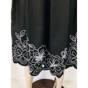 Vintage 90's Y2K Robbie Bee black/white strapless fit & flare midi dress, lightly boned at the bust, pleated waist, full skirt floral embroidered border, fully lined, hidden rear zipper hook & eye closure, size is marked 4 fits a modern XS/S/M depending on your measurements and desired fit.