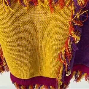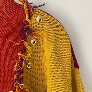 Vintage 90s Y2K Spree International Knit Fringe Multi Color Sweater size small in great condition. Couple of little spots see pics and slight discoloration on some of the gold embellishments. Measurements laying flat are chest 24 inches across and length 27 1/2 inches long. Oversized fit great over leggings!