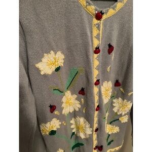 Vintage 90s Y2K Storybook Knits Sweater Flowers and Lady Bugs Size Small. Light blue color with embellished white and yellow flowers. Pattern on both front and back of the sweater. Small ball embellishment on the edges. Lady bug buttons and embellishments.