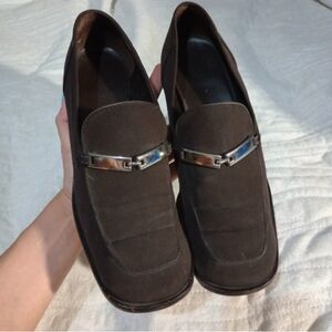 Vintage 90s Y2K nine west academia chocolate brown square toe chain detail block heel loafers