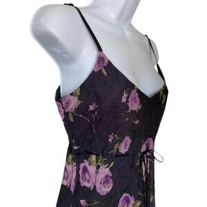 Vintage 90s Bebe black and lavender floral, ruffle hem, adjustable spaghetti strap midi dress with woven velvet ribbon tie for cinching under the bust. Such a cool piece. This one is definitely taking a nod from Betsey Johnson. Fabric and size tag is missing. Fits like a modern size S. Check measurements below. Fabric is most likely a viscose / rayon type fabric with a crinkle effect. Fully lined. In great shape. No flaws found. Questions? Please ask. All sales final. Returns are not accepted. No refunds. Thanks so much for looking.