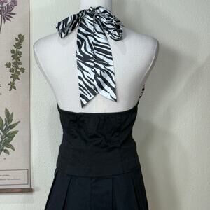 Tie halter, satin zebra print, hook & eye front closure, elastic stretch back, faux pockets