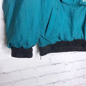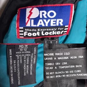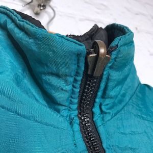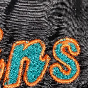 100% nylon with polyester filling. Black with large Dolphins emblem at back, front pouch with snap. Reverse side is turquoise with "Dolphins". Embroidered across the back, pouch with snap. 3/4 zip, missing zipper pull. Zipper at side seam for ease of putting on and taking off. Elastic at cuffs and waist. Good Used Condition - Some staining on emblem on turquoise side