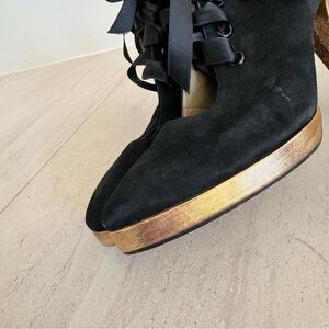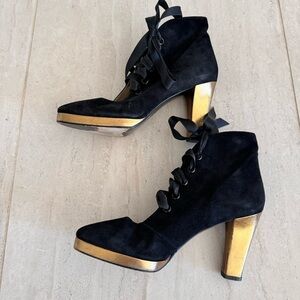 90s Yves Saint Laurent Black Suede Heels. Lace-Up style. Satin ribbon tie. Color black with gold leather heels and details. Heels have some wear on leather, nothing major - normal wear. Please see close up pictures. Size 39 - fits US size 8 or 8.5.