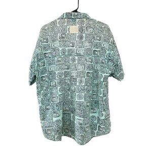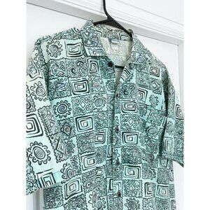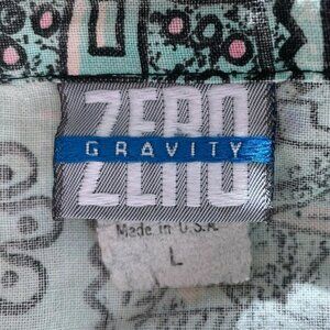 Vintage 90's Zero Gravity men's casual button up shirt. The shirt is a washed turquoise with black, peach and blue accents. It's very Saved By The Bell! Shirt is made of 100% cotton and is a man's size large.