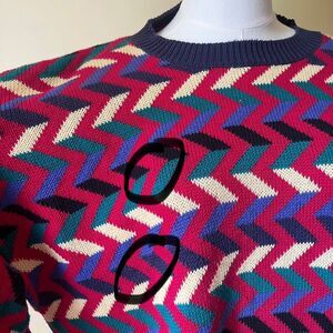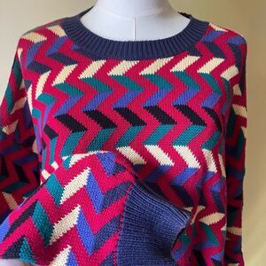 vintage 90s sweater, made in Hong Kong knit, colorful zig zag pattern, cotton crewneck jumper, retro chevron sweater, oversized knit pullover