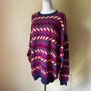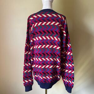 Vintage 90s Zig Zag Sweater Hand Loomed Red Blue 100% Cotton Crewneck Large