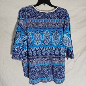 Vintage 90s beachy boho blue patterned 3/4 sleeve blouse v neck blouse