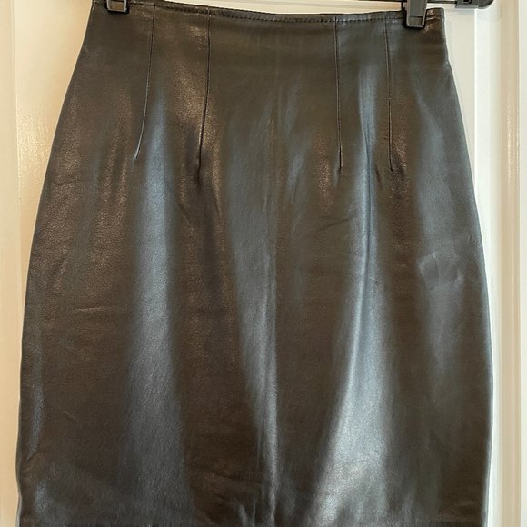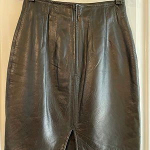 Vintage 90s black leather skirt with back zip, size 6. Please let me know if you have questions or would like additional photos or details!
