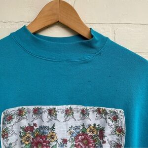 Vintage 90s blue Cotton Crewneck sweatshirt w/ 50’s floral hanky sewn on front