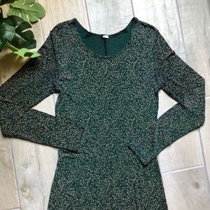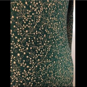 Vintage 90’s boho dress in jungle green and gold floral detailing. Long sleeves and round neckline. Fitted throughout and falls at the hips into a swingy/flowy skirt. Ahh this dress is everything.