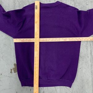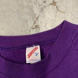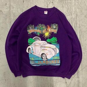 This is a vintage 90s Car Graphic Crewneck Sweatshirt made by JERZEES. It features a purple color and a graphic print pattern. The sweatshirt has a crew neck and long sleeves, and it is a size large. The material is cotton and it has a regular fit. The sweatshirt is a pullover style and has a vintage look. It is suitable for men and can be worn for casual occasions.