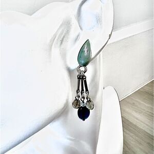 Excellent vintage condition silvertone 90’s earring for pierced ears. Teardrop style sage green enamel with cascading strands of iridescent clear and semi opaque blue beading. Purchased in the late 90’s. Never worn. Have been in storage since purchasing. Comes with clear rubber stoppers as shown. Truly one of a kind artisanal boho earrings. Measurements in photos. All earrings sanitized prior to shipping.
