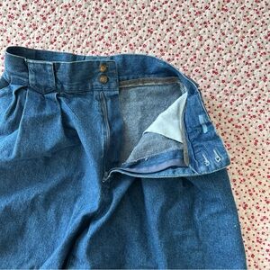 Vintage 90s denim high rise baggy shorts oversized jorts with pleated front, double button closure, cuffed hem, nylon zipper fly.