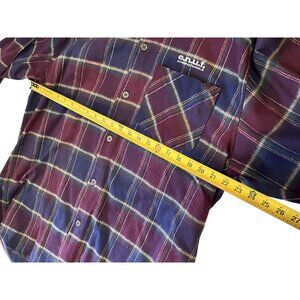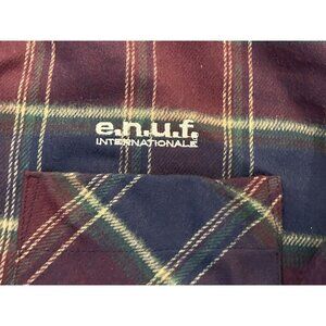 This vintage 90s e.n.u.f. Internationale plaid shirt features vibrant red and blue hues. Perfect for retro style enthusiasts looking to add a unique touch to their wardrobe. Its small size ensures a snug fit, ideal for layering or standalone wear.