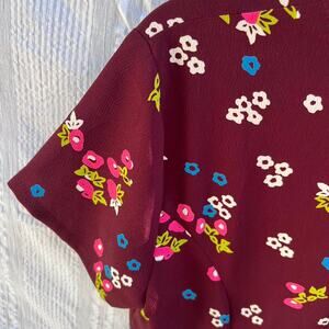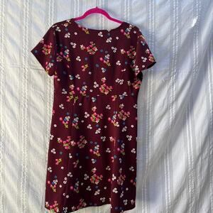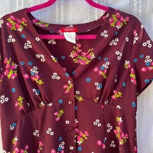 burgundy floral, short sleeve, 90s style, unlined, midi dress, juniors fit, vintage dress, casual summer, boho vibe, floral print