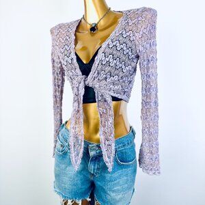 This vintage 90s grunge cropped sweater top top is pastel purple in color, and ties in the front. The condition is very good, and the marked size is Medium. It would best fit a size Small/Medium. Please measure yourself before buying if you plan on wearing it.