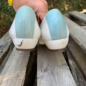 Vintage 90s 5th Avenue leather pastel geometric flats. Good condition. Some scuffs. Leather on one heel has a small tear pinky fingernail size. Shoes pass flex test.