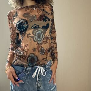 Stunning! 90s/00s tan micro mesh blouse with romantic blue & brown floral print. Sheer.