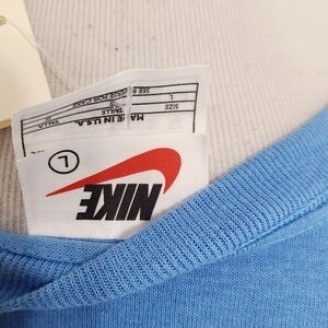 Vintage retro 90s Nike blue short sleeve v-neck tee. Blue with a yellow swoosh. 100% cotton. Made in USA.