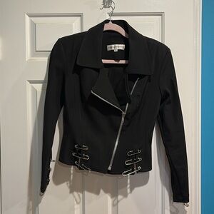 Amazing black jacket by John Murrough. So very funky! With asymmetrical zipper and big safety pins accents. Heavy jersey (scuba) material. Shoulder pads (can be removed). 20” long. Size 8. Very good condition.