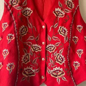 This vibrant vintage 90s red wool vest is a true statement piece with intricate full-front embroidery in rich, colorful threadwork. Crafted from warm, structured wool, it features a classic button-down front and a flattering boxy fit. Eye-catching and bold, this vest brings a festive, folksy, or artsy flair to any wardrobe. Marked or fits like a size large.