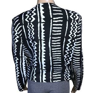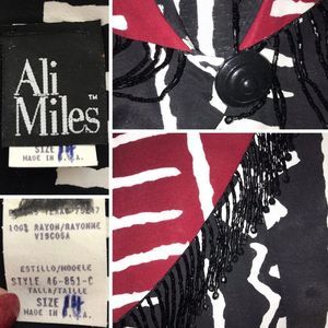 This vintage 1990s cropped jacket is by Ali Miles and is 100% rayon. It is a funky bold red white and black print trimmed on the front lapels with black bead tassels and long sleeves. Cropped length. One single button at waistline. Excellent condition.