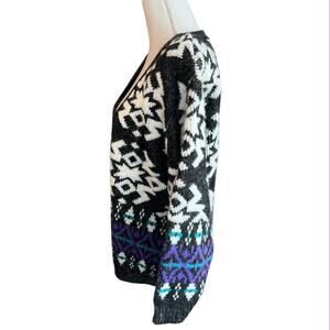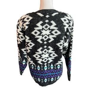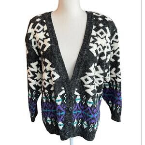 Women’s vintage chunky knit cardigan sweater, featuring a button down front with a gray base and snowflake geometric print. Great condition and made in the USA from mervyn’s.