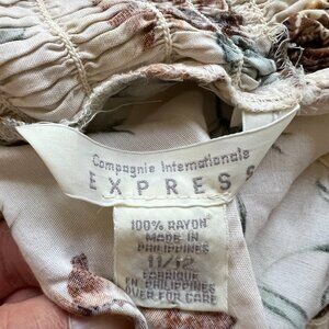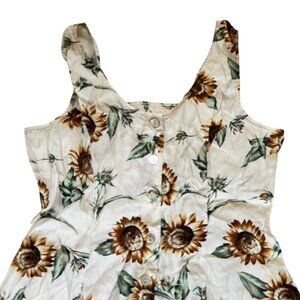 Vintage 90s Compagnie Internationale Express dress, white-cream with sunflower print, sleeveless, abalone button front, smocked back, midi length, size 11/12, pit to pit: 20", waist flat: 16", length: 51", preowned and shows wear at the underarms - see photos