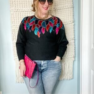 Outrageous vintage 90s vibrant sequin neckline loose knit dolman fit sweater! 90s favorite blend of ramie cotton. This has a Dolman fit so the shoulders and chest are really open measurement.