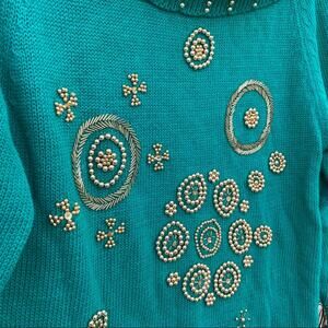 Vintage 90s teal gold art deco beaded cowl neck tunic sweater MEDIUM