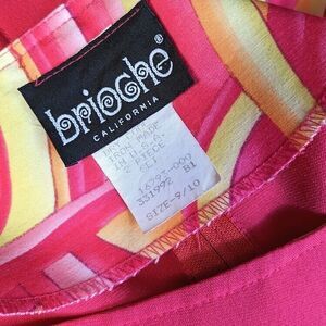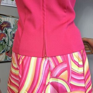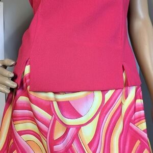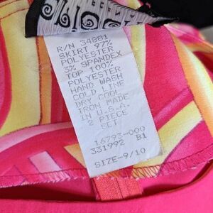 Vintage late 90s, early 2000s (y2k) Brioche mini skirt and top set. 90s does 60s mod. Sleeveless top that zips up back. Split front at hips. High neck. Skirt features psychedelic print in pink and yellow. Skirt zips up back. Unlined. Set is in good vintage condition with little wear.