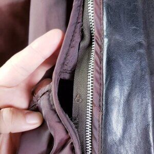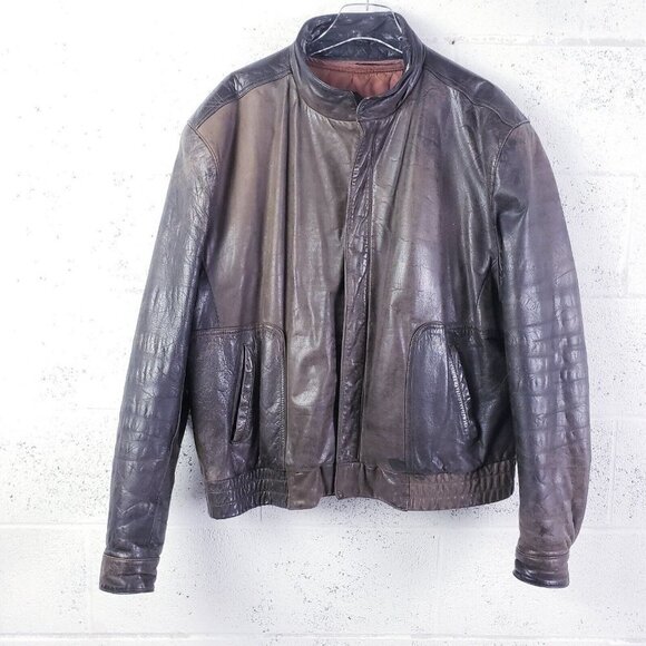 Beautiful Genuine Brown Leather Outer Shell with amazing Grunge distressing and patinaSatin Nylon liningZip out insulated linerFront slip pocketsInner hidden pocketFull zip front with snap closureCollaredBrand: Reed Sportswear