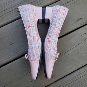 Vintage 90s y2k Square Cap Toe Chunky Heel Pink Tweed Granny Loafers 8 WIDE