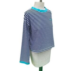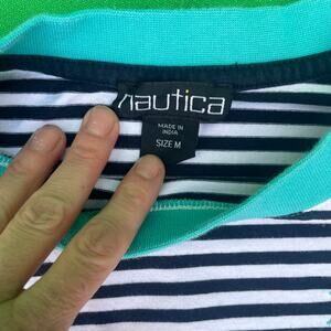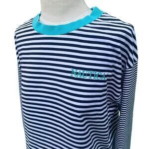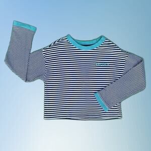 Really cool vintage long sleeved t-shirt made by Nautica. Stripes are white and dark navy, the sleeves also have a smaller stripe that contrasts. Trimmed on the neck and sleeves with aqua fabric, and features an embroidered Nautica hit on the front. Nice soft cotton. Boxy cropped fit. 100% cotton. Size medium
