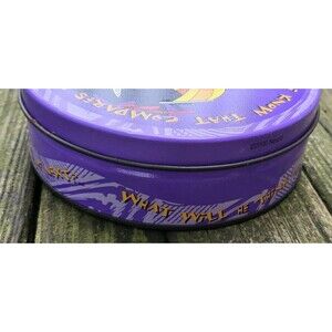 The product is a vintage 90s/2000s Wonka Purple Lolly Candy 6" round metal tin. Pure Imagination! This collectible advertising merchandise and memorabilia piece is perfect for fans of Wonka and candy enthusiasts. The purple color adds a nostalgic touch to this whimsical and imaginative piece, making it a unique addition to any collection.