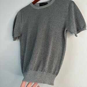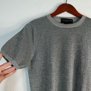 This gorgeous and versatile lightweight sparkly knit sweater with short sleeves and ribbed trim is the perfect textured knit. Great for layering and styling in a variety of ways!