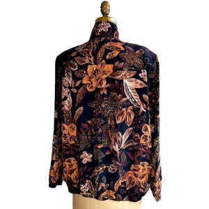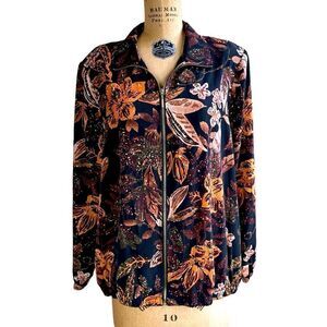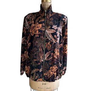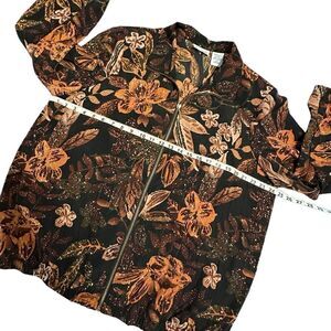 Vintage 90s Blair Lightweight silky Brown, orange and black floral print full zip unlined bomber style Windbreaker jacket size large. Elastic cuffs and waist..