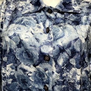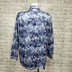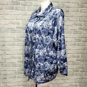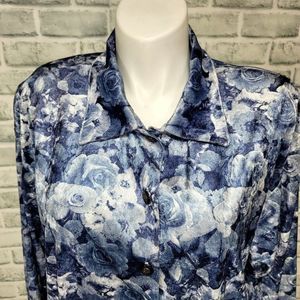 Vintage 90s Cervelle Womens 2X Blue Velvet Rose Floral Pattern Button Front Top