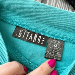 Vintage 90s Gitano cropped top in a vibrant teal hue with a cute Scottie dog patch on the front pocket, featuring Scottie Love and Active Lifestyles. Made from a lightweight cotton-blend fabric with a crisp feel, similar to the material used in scrubs, this shirt has a relaxed, slightly boxy fit with dropped shoulders, ribbed cuffs, and a mock neck. Perfect for casual styling, layering, or a nostalgic throwback look.