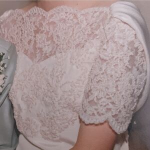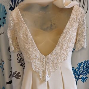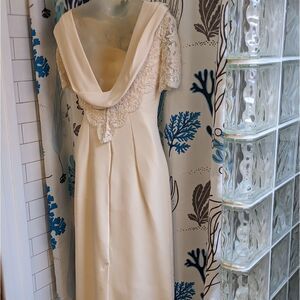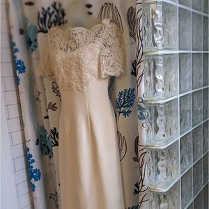 My mom started sewing when she was a teenager in the 60s and made every formal dress I ever wore including this stunning custom wedding dress that she made in 1997. Ivory cream Dupioni silk layered with matching pearl beaded lace on the bodice. Cap lace sleeves, open V back w/attached silk shawl. Separate enormous removable circle train that hooks on the back. Back zipper, fully lined, 8 hooks for the train.