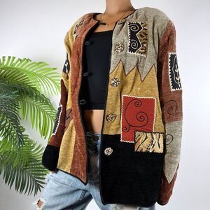 Features neutral brown & tan colors, button closure, round neck, and embroidered patches. Omg! This jacket is so cool and there are so many beautiful little details! It looks amazing over everything and it's a great statement piece! It fits a little oversized.