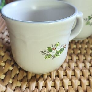 Dainty little white flowers mixed with Christmas Holly Berries & greenery. Set of 4 retired Pfaltzgraff stoneware 'Christmas Heirloom' pattern gray stoneware. Scalloped edging on saucers