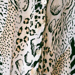 Short-sleeve vintage 90s/Y2K animal print blouse featuring a lightweight textured fabric with mixed orange, white, and black animal prints. Classic, glam, and timeless with a structured collar and clear plastic buttons featuring a subtle white tortoiseshell effect. Fits like a Medium/Large. A versatile piece that works well styled with black denim, trousers, or layered jewelry for an elevated look. Excellent vintage condition. Measurements available on request.