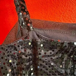 Vintage 90s/Y2K Black sequin zebra print mini dress size M. Cami straps. Black on Black. Mesh trim along the top front. Has a shimmery sequin like embellishment. Zips up the back. Small flaw at the base of the strap in the back, part of the fabric is coming undone (pictured). Dress is lined. Has some stretch but please use measurements for sizing accuracy.