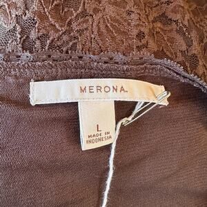 This vintage 90s/Y2K Merona top is a size large. It's brown and has a floral lace overlay. It has sort sleeves, a v neckline, is a nylon/spandex blend and machine washable. This top has whimsygoth vibes and is in good vintage condition.