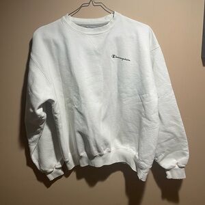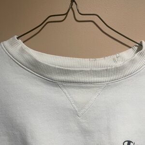 White: Vintage y2k champion sweatshirt! No major flaws other than a stretched neck as well as little rips on the neck which is pictured! Piling as well!
